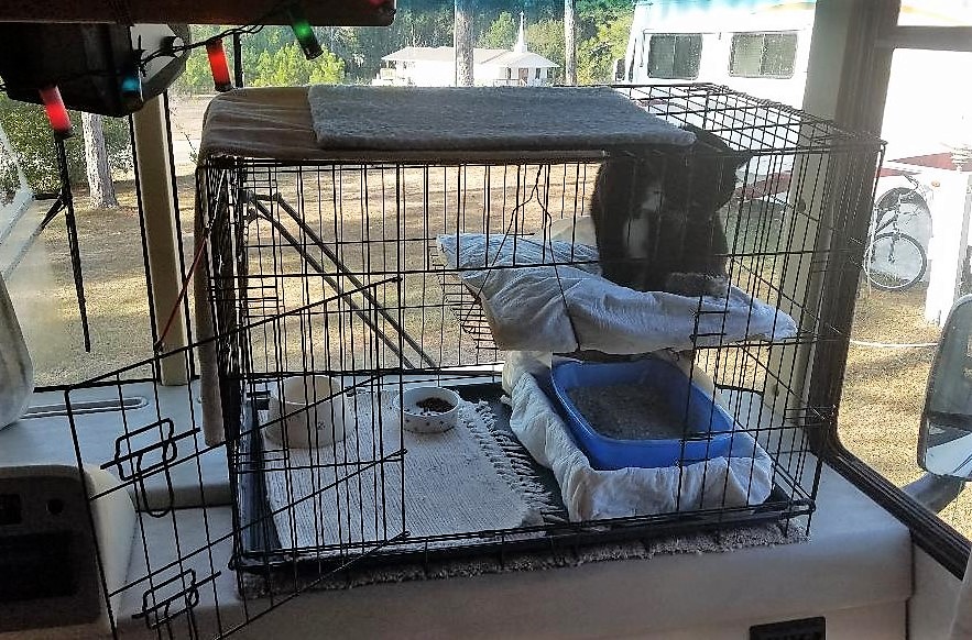 As many of you know, Pye doesn’t travel well. You may recall the time she destroyed her brand new (cloth) carrier in a howling fit a few years ago during our return trip from the time she rode in the chassis for 150 miles. Clearly, she doesn’t do many things well like staying put, with the possible exception of eating, shedding and scratching furniture.