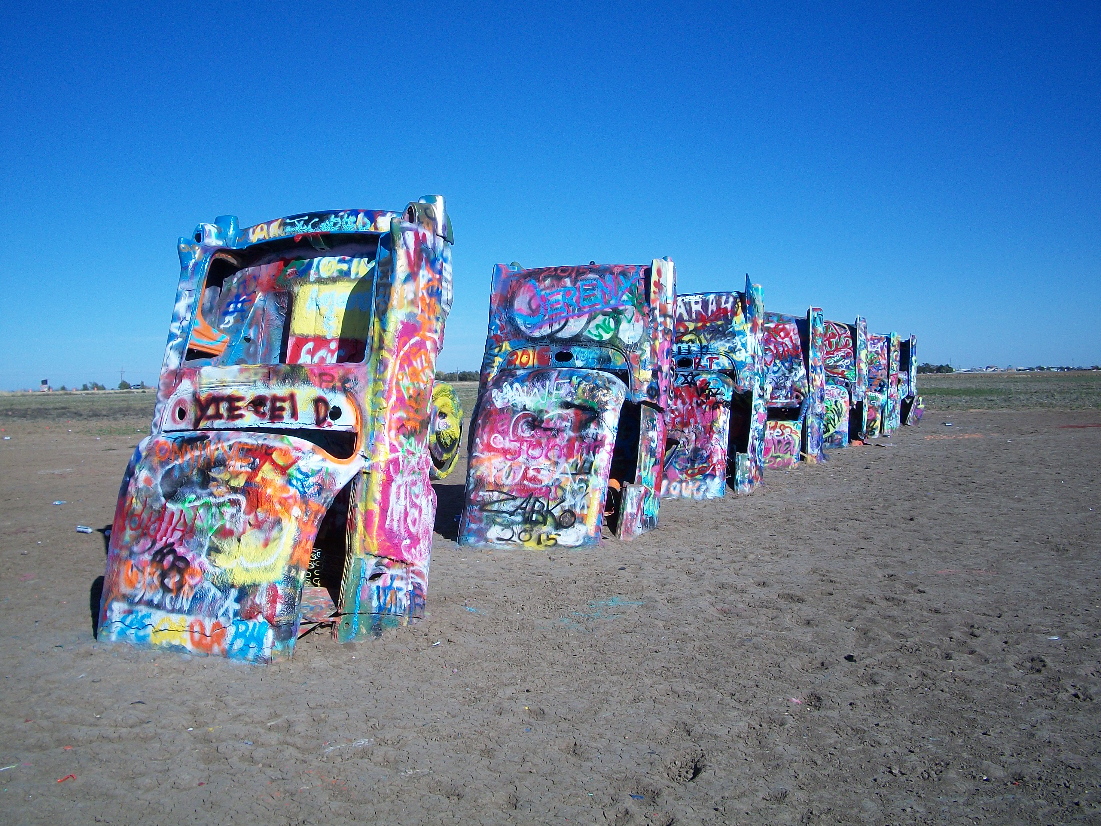 The original art installation in 1974 was of stock Cadillacs in original pastel colors. Note use of the word “original pastel colors”. The cars are now brightly colored due to copious layers of graffiti. To say the graffiti is thick is an understatement of no small measure. Graffiti covers ever inch of the Cadillacs. Spray cans litter the ground. The windows have been broken out.