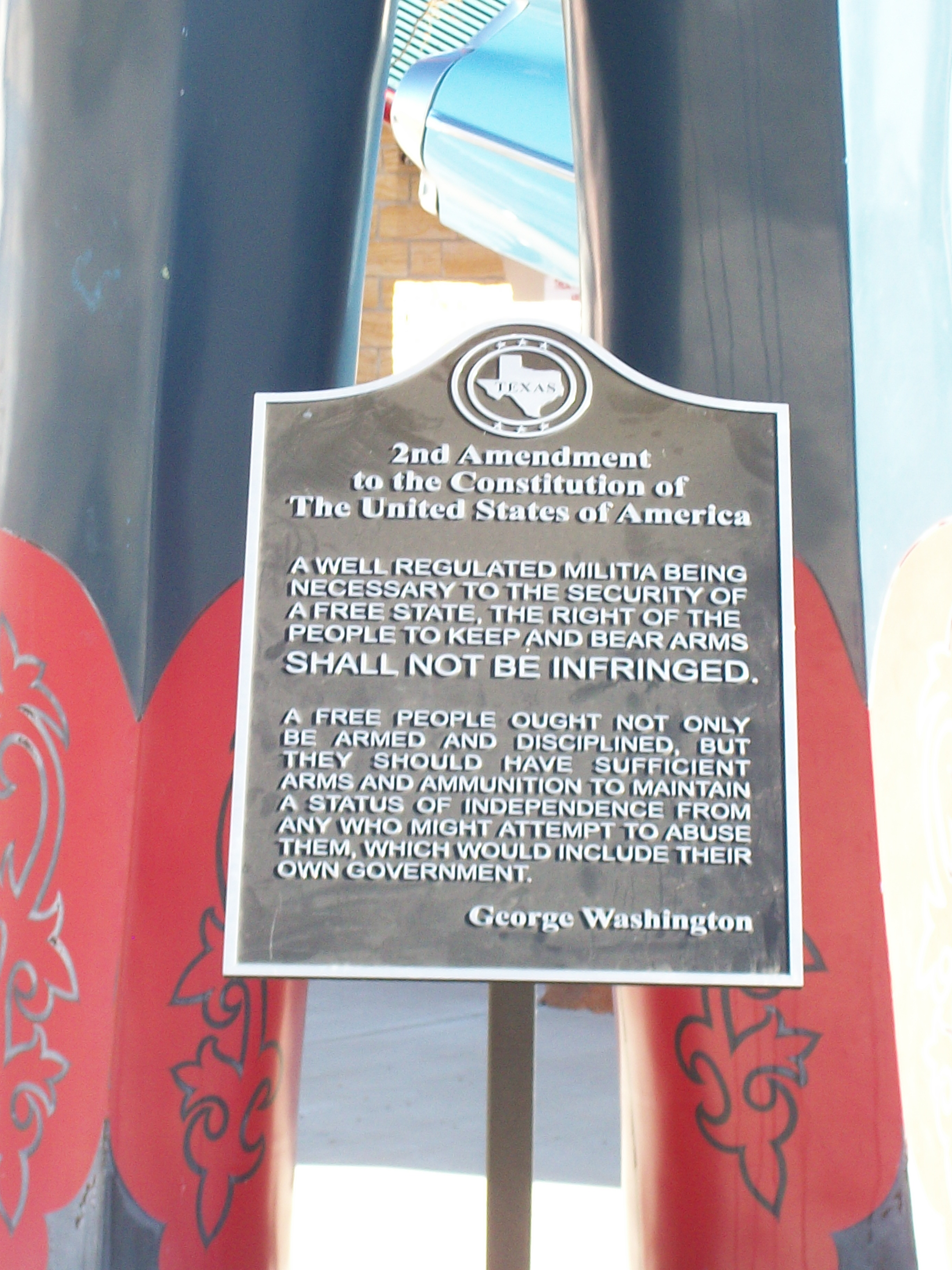 You would like Gonzales, Texas (and all of Texas)… The city’s flag is a picture of a cannon, and the words “Come and Take It”. If you Google it, you’ll see pics. T-shirts are also available, with cannon or automatic rifle.
