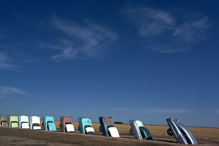 In 1974 in Amarillo, Texas, a group of three artists, Chip Lord, Hudson Marquez and Doug Michels, created the Cadillac Ranch art installation, with the financial backing of Stanley Marsh III. The artists were part of a group called Ant Farm, and as such they created several architecturally unique installations around the country. This installation, ten used Cadillac cars buried ass-end up in the ground, at an angle corresponding to that of the Great Pyramid, is slightly west of Amarillo on the former Route 66.