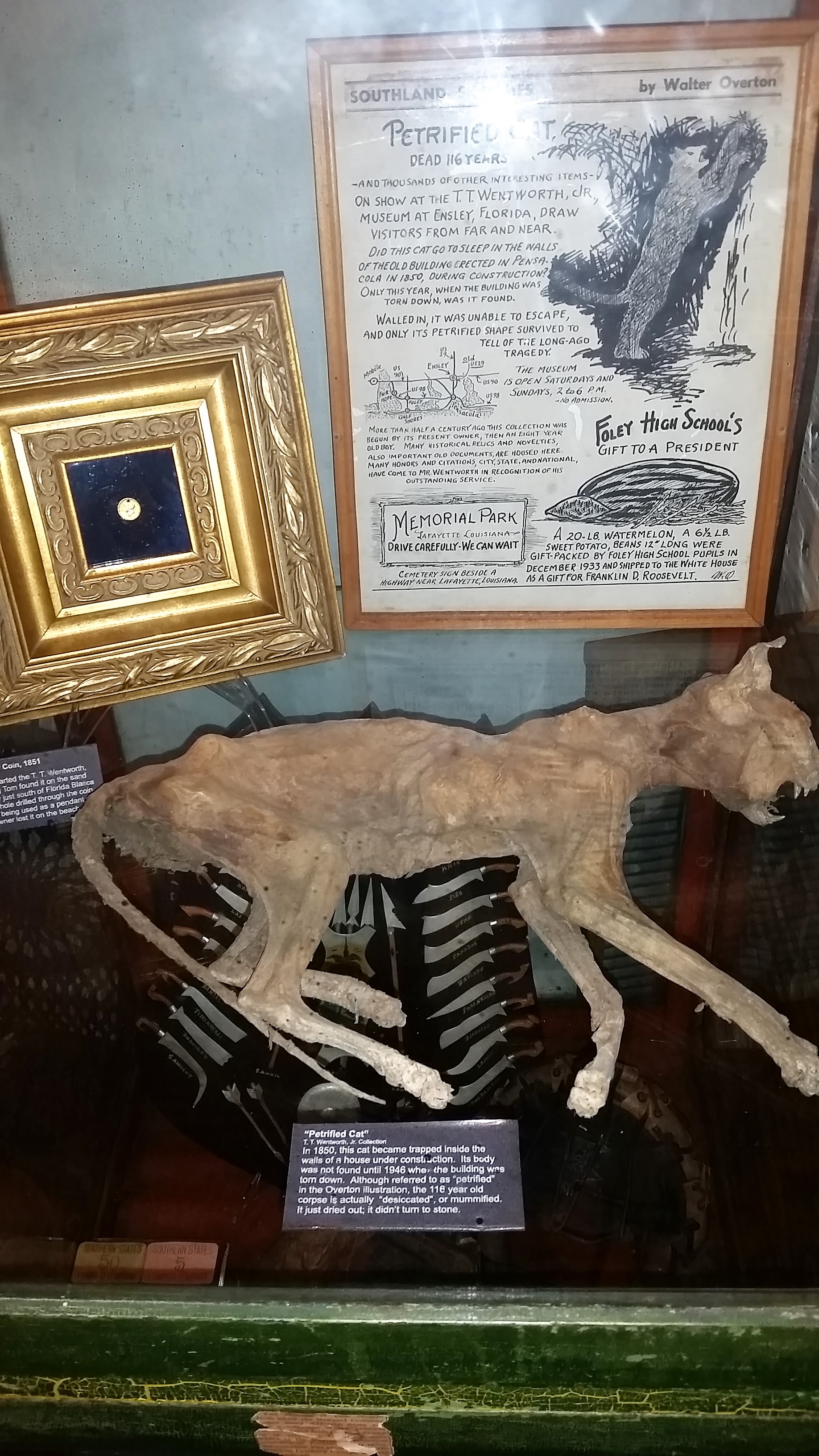 On display at the T.T. Wentworth, Jr., Museum in downtown Pensacola, a small card below tells of the unfortunate fate of the feline from 1850.