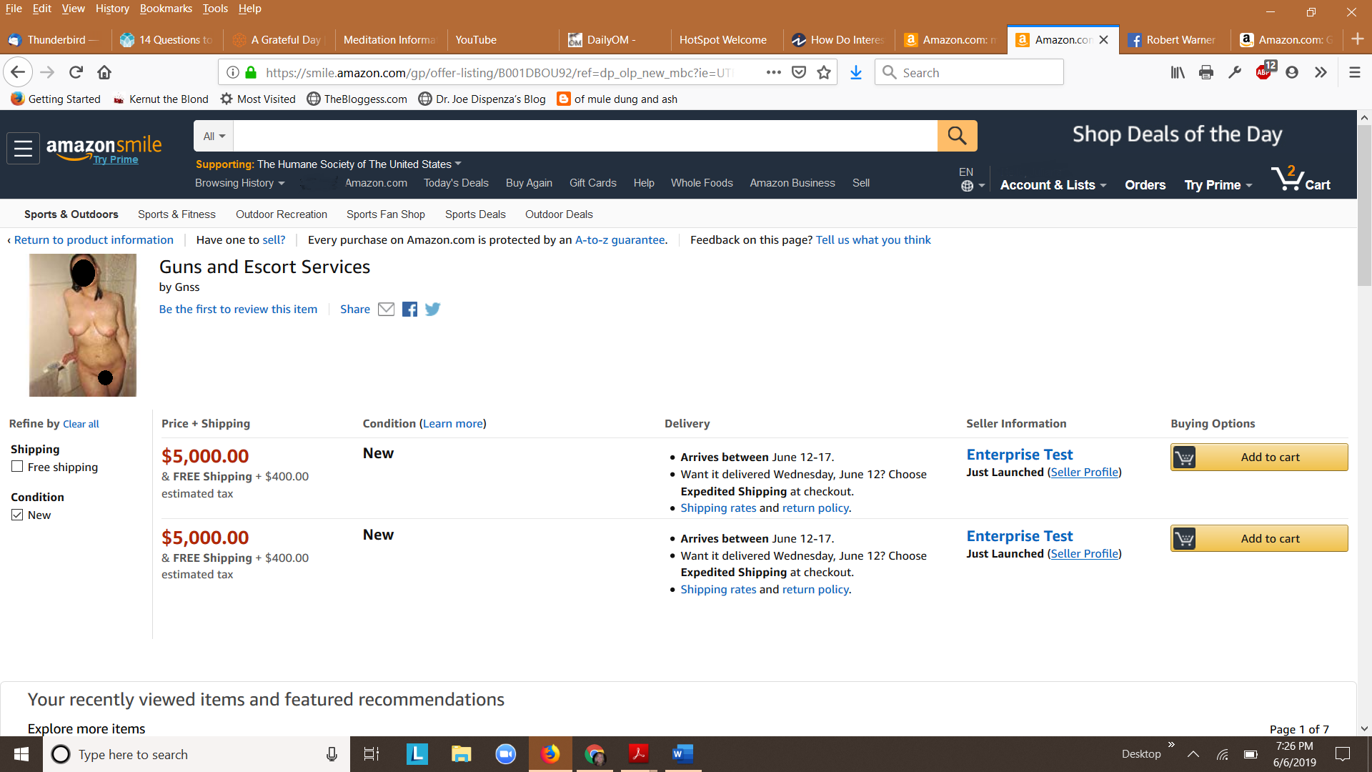 I forgot to mention that while it isn’t visible in my screenshots, an avid reader of this blog, Joe, mentioned that he can see the original ad date of the first ad was May 5 – over a month ago! The review of Cocaine and Hookers is from May 21 – almost three weeks ago. Clearly, Amazon has NO IDEA WHAT THEY ARE OFFERING FOR SALE.
