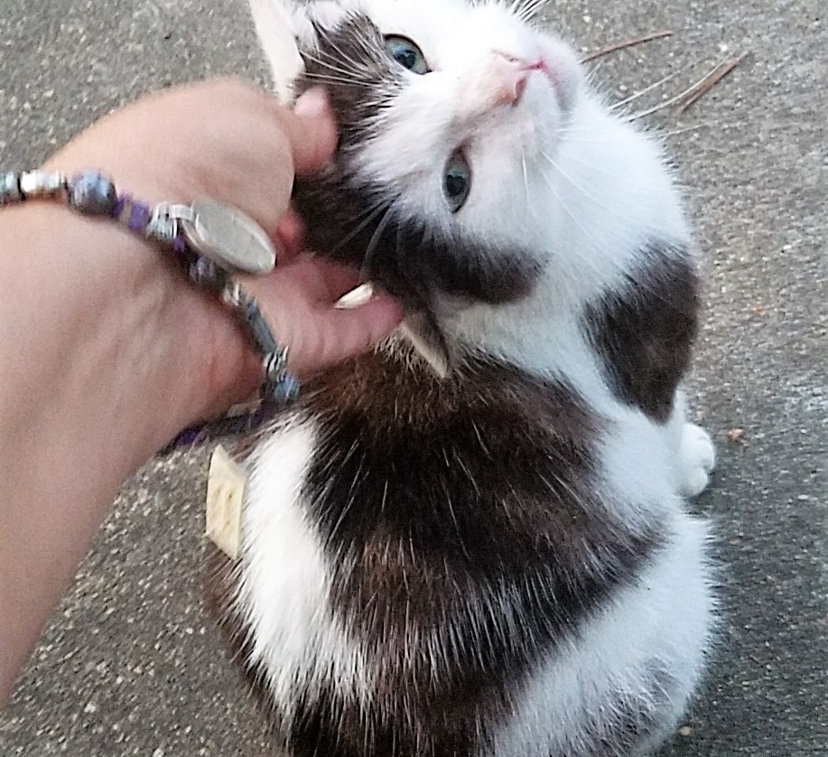 There are many stray kitties at this RV park and one, in particular, is noticeably friendlier: She doesn’t run off and hide like the other feral kitties. She will hang around and “talk” to you – even after she’s been fed. (Of course I feed her. Hellooo… rescuer of strays, here.)