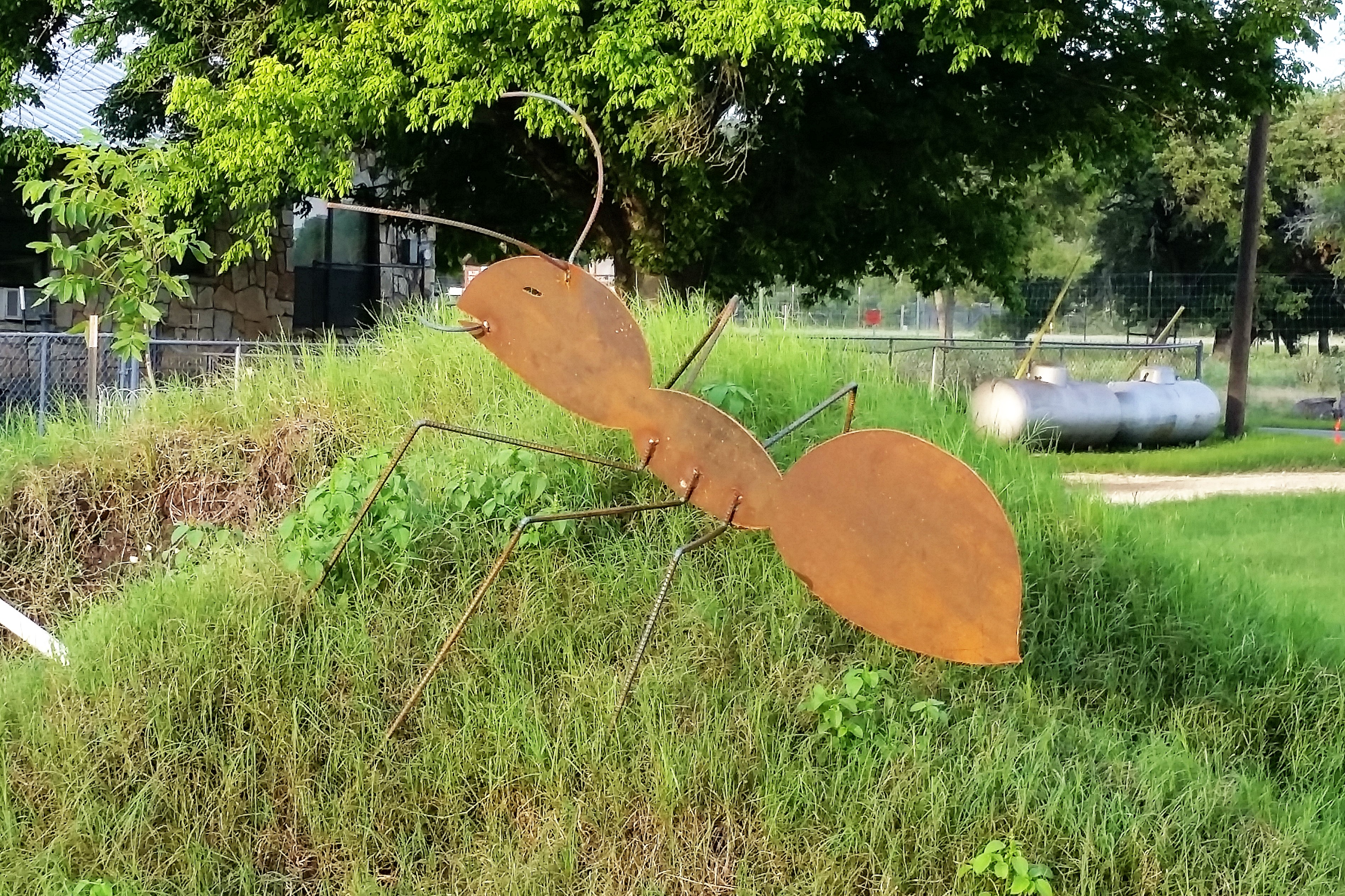 When I was in north Texas Hill Country near Kerrville, I would walk through the neighborhood. One day, shortly after I snagged the photos of the giant ant in their front yard (below), this fence and gate showed up.